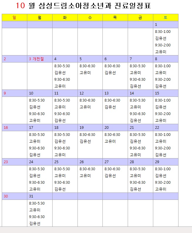 삼성드림소아과 10월 진료표